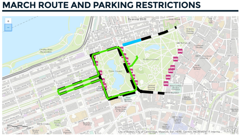 While the march itself begins at 12:30 p.m., the event will get underway at 11 a.m. with speakers on the Common. The city said streets along the route will likely be impassable from noon to 2 p.m., and there may be traffic restrictions on Charles Street, between Boylston and Beacon streets, before then.