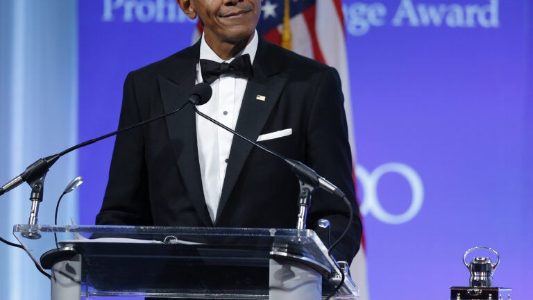 Former President Barack Obama swung into Boston Sunday night to accept the John F. Kennedy Library’s Profile in Courage Award and to deliver his most high-profile post-presidency speech to date.