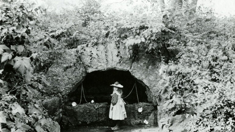 In the black-and-white photograph dated 1893, a young girl stands near a cavernous drinking fountain in Franklin Park, leaves and branches spilling around it as she reaches for a cup of water.