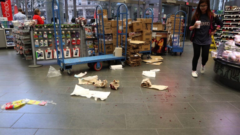 The aftermath of the incident was visible inside the store where bloodstains and a small pile of crumpled and bloodstained paper towels remained after police allowed the store to reopen around 7:15 a.m.