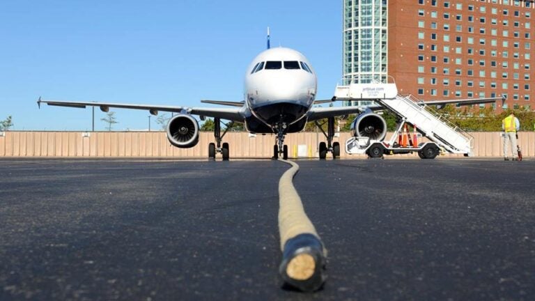 Volunteers pulling JetBlue plane at Logan airport to raise cancer funds