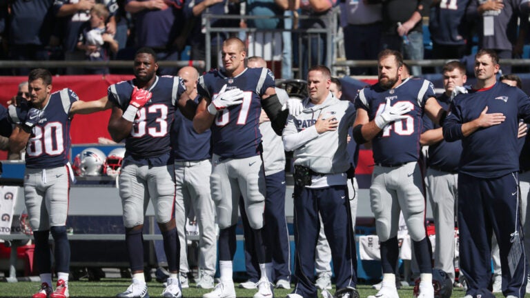 During Sunday’s game against the Carolina Panthers, the Patriots stood with their right hands on their chests and their left arms wrapped around their teammates