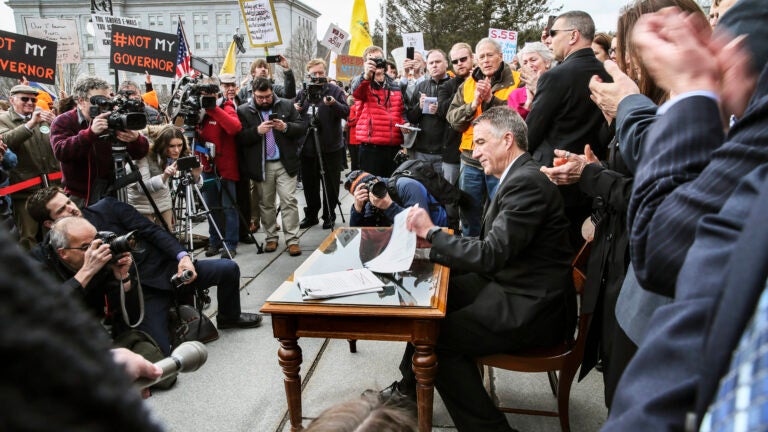 Standing on the Statehouse steps before a noisy crowd of hundreds gun rights activists and supporters, Gov. Phil Scott signed the bills into law. Supporters shouted “thank you,” while opponents, many wearing hunter orange, shouted “traitor!” and booed the governor.