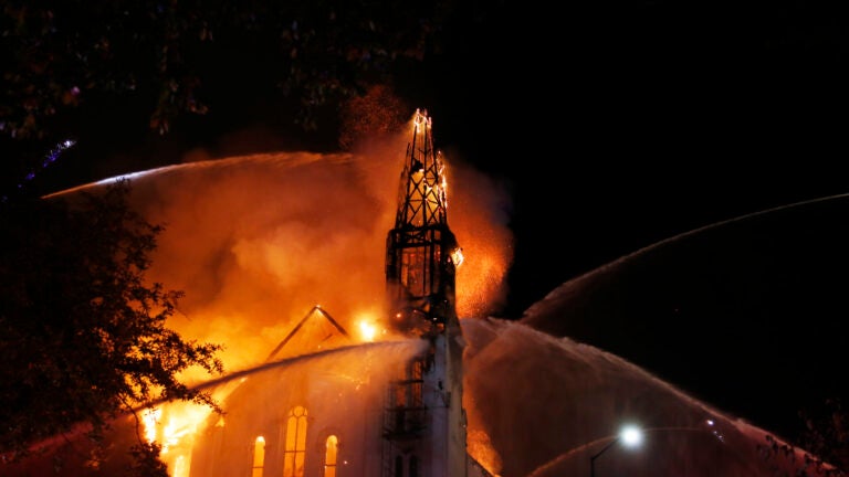 Officials at the historic Wakefield church that was consumed by a seven-alarm fire on Tuesday night say they are moving “into the future with trust, hope, and gratitude.”“We are grateful to God and to you,” a statement on the First Baptist Church of Wakefield’s website reads. “While we lost our historic building from a lightning strike this week, we praise Jesus that our church community was kept safe. A very big thank you to the many firefighters who did their jobs with excellence, and to the outpouring of support from the community.”The Wakefield Fire Department received an automatic alert of a fire in progress from the church at 8 Lafayette St. around 7 p.m. on Tuesday, the department said in a statement. Firefighters arriving on the scene a minute later saw flames showing at the front of the church near the steeple. A group that had been meeting in the church at the time exited safely before the department arrived.“Shortly thereafter, the fire broke out and extended the full length of the 150-foot steeple, moving to the front of the church, all the way to the back,” the fire department said. The fire eventually reached seven alarms as it engulfed the landmark building. More than 100 firefighters from about two dozen departments responded to battle the blaze, which burned for roughly three hours and caused more than a million dollars in damage to the nearly 150-year-old building.“The church has been deemed a total loss,” the fire department said.