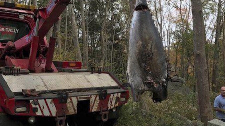 The bluefin tuna worth an estimated $10,000 was found in the woods of Gloucester in October 2017. A tow truck was needed to haul it out of the trees.
