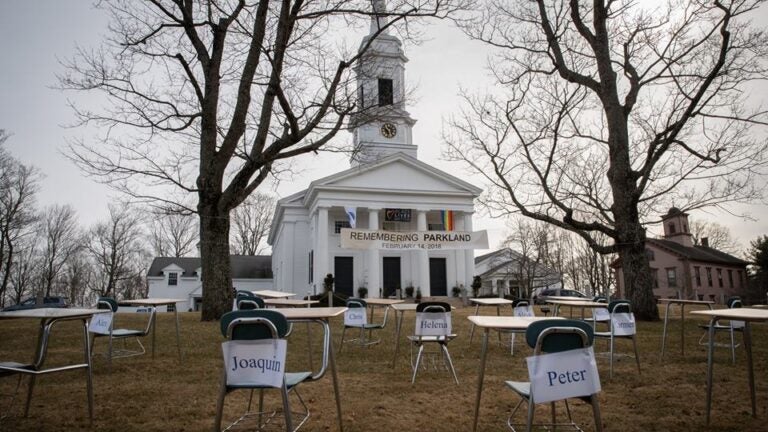 17 empty school desks stand outside Sherborn church, a year after Parkland shooting