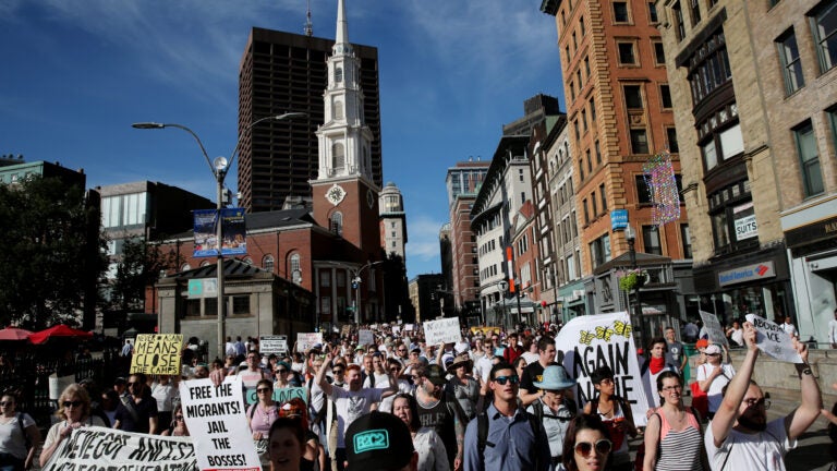The crowd, which mobilized in connection to a protest outside a New Jersey detention center on Sunday, carried signs and chanted as it moved from the New England Holocaust Memorial on Congress Street, onto Tremont Street, and into Chinatown on its way to the Suffolk County House of Correction in the South End, The Boston Globe reports.