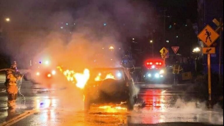 In the video, flames appear to explode from the vehicle and the whole thing is quickly engulfed in flames. On the opposite side of the street, the video shows Cyr pull over and run toward the flaming car.