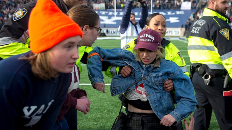 New Haven, CT - An officer lifts a student up during the protest during the halftime of the college football game between Harvard and Yale at the Yale Bowl in New Haven, Conn. on Saturday, Nov. 23. (Nic Antaya for The Boston Globe) Topic: HarvardVYale Nic Antaya for The Boston Globe