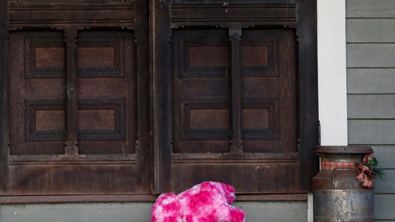A stuffed animal lays outside the door to the home of the 11-year-old girl who was allegedly abducted and rescued this week in Springfield. Jessica Rinaldi / Boston Globe