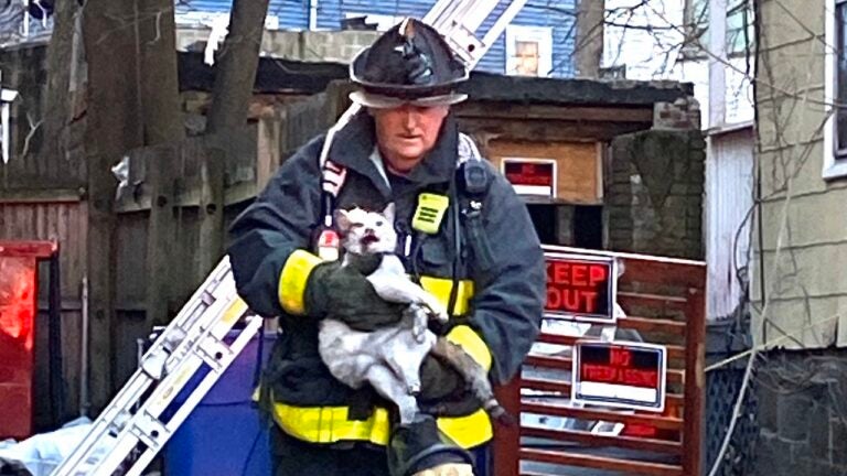 Both were rescued from the third floor of the home at 357 Seaver St., according to spokesman for the Boston Fire Department. Officials snapped a photo of a firefighter clutching the rescued feline, and then administering oxygen – Sparkles was experiencing some shortness of breath.
