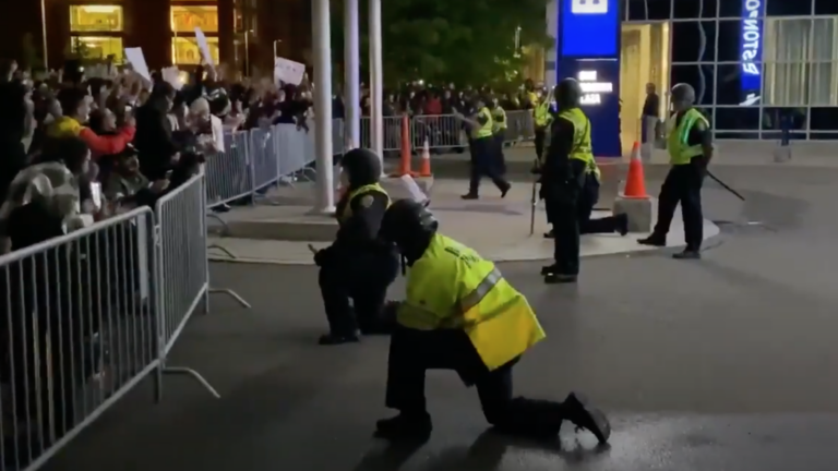 According to WBUR reporter Max Larkin, police outside the station took a knee, and a bottle was thrown over the barricade soon after the show of solidarity ended.