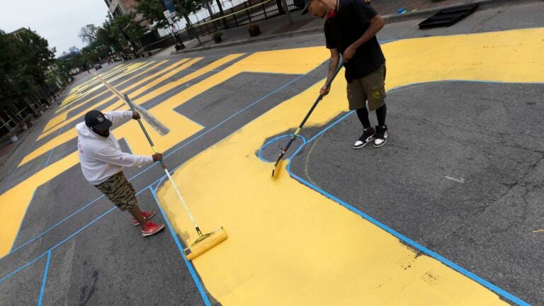 BOSTON (AP) — Volunteers using yellow paint began filling in a Black Lives Matter street mural on Sunday, a day after hundreds of people used the Fourth of July holiday to call for justice on behalf of Black victims of police violence.