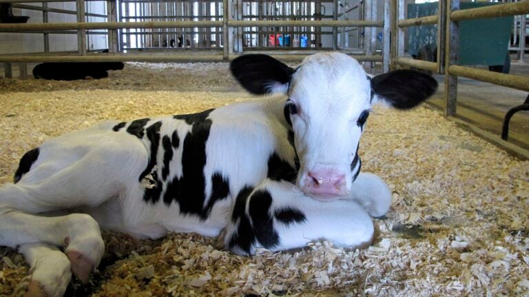 A newborn calf lies in a pen at the University of Vermont dairy farm Thursday, July 23, 2020, in Burlington, Vt. (AP Photo/Lisa Rathke)