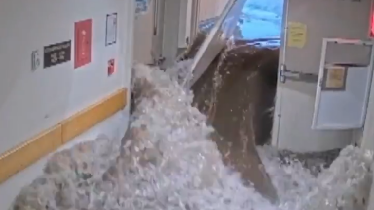 The video shows a wall of rainwater slowly pushing its way between a pair of exit doors. The flood forces one of the doors backwards before tearing them both completely off the hinge. The torrent appears to flood the hallway at least waist deep.