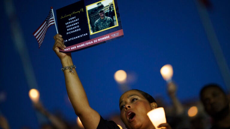 “Our city will never forget her name,” Mayor Kendrys Vasquez of Lawrence told the crowd at Veterans Memorial Stadium. Vasquez asked for 13 seconds of silence, one for each U.S. service member who died in the Aug. 26 bombing.