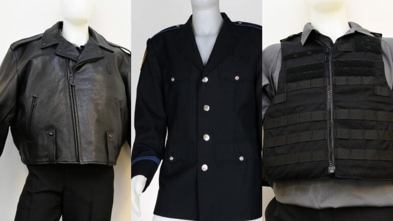 Among the items believed to have been stolen are what appears to be a leather jacket, a formal police suit jacket, and a vest, according to photos of similar items shared by Weymouth police.