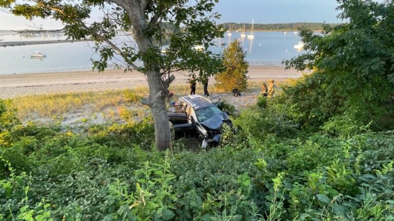 Onset fire officials shared photos on social media that show a mangled, dark-colored car resting in the shrubbery next to the beach, with police and fire officials nearby. Emergency vehicles lined the seaside street.