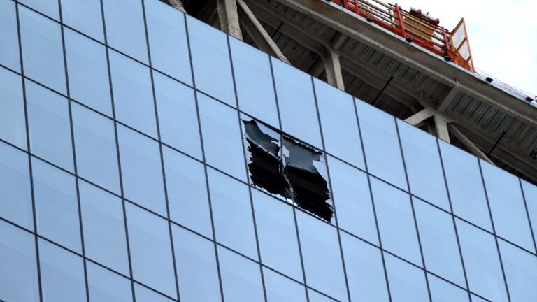 Photos obtained by the Globe showed a damaged window in the South Station Tower. The beam reportedly broke several windows on its way down.