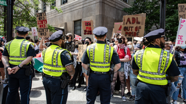 Liberate Boston Pride also shared images and videos of the protest, showing what appears to be dozens of officers lining barricades and some breaking up groups of people. According to the police report, the protesters were locking arms, “forcing officers to physically remove individuals who are interlocked together.”
