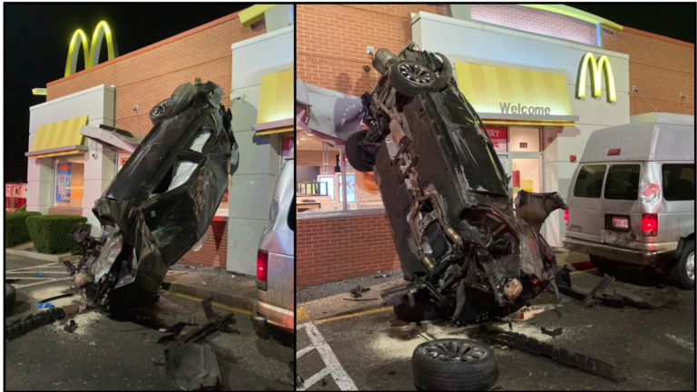 Photos of the crash released by the department show the car’s trunk smashed into the awning of the fast food restaurant. The front hood of the car rests on the curb. Every part of the car appears to be significantly damaged, and there seems to be debris scattered around the establishment building.The vehicle appears to be missing the entire front left wheel, while the roof and doors all bear significant dents.