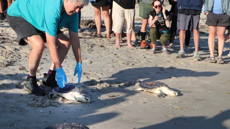 Staff veterinarians cleared the sea turtles to return to Nantucket Sound off West Dennis Beach. Their caregivers sent them off on Thursday as crowds of curious onlookers watched.
