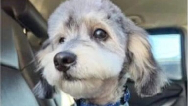 Rocky is a 7-month-old mixed breed shih tzu-poodle with a gray and black upper body and white bottom, police said in a statement.