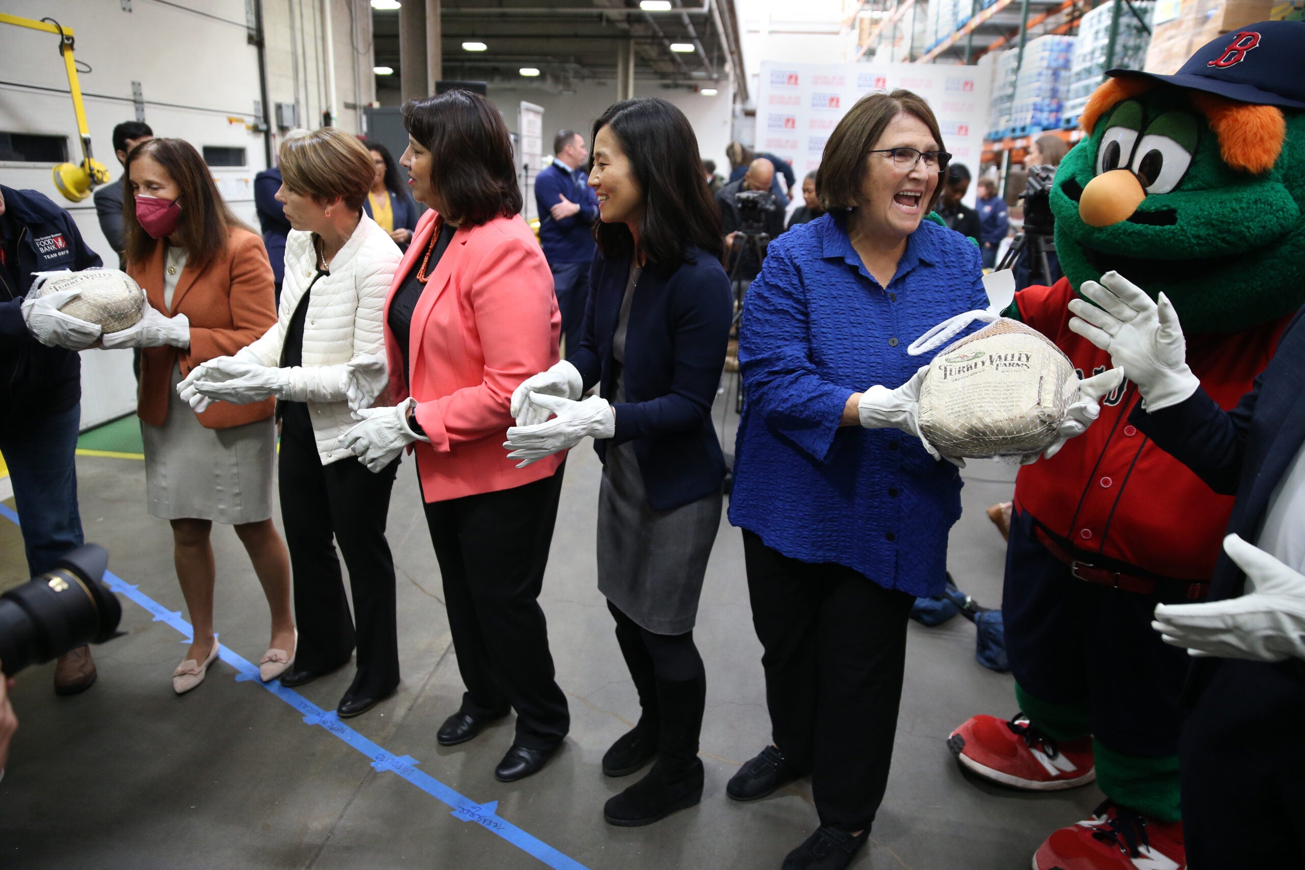 The food bank hosts its annual “Chain of Giving” event in early November, where politicians, public servants, and Red Sox mascot Wally form a giant human chain while unloading turkeys from the delivery trucks.