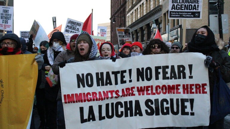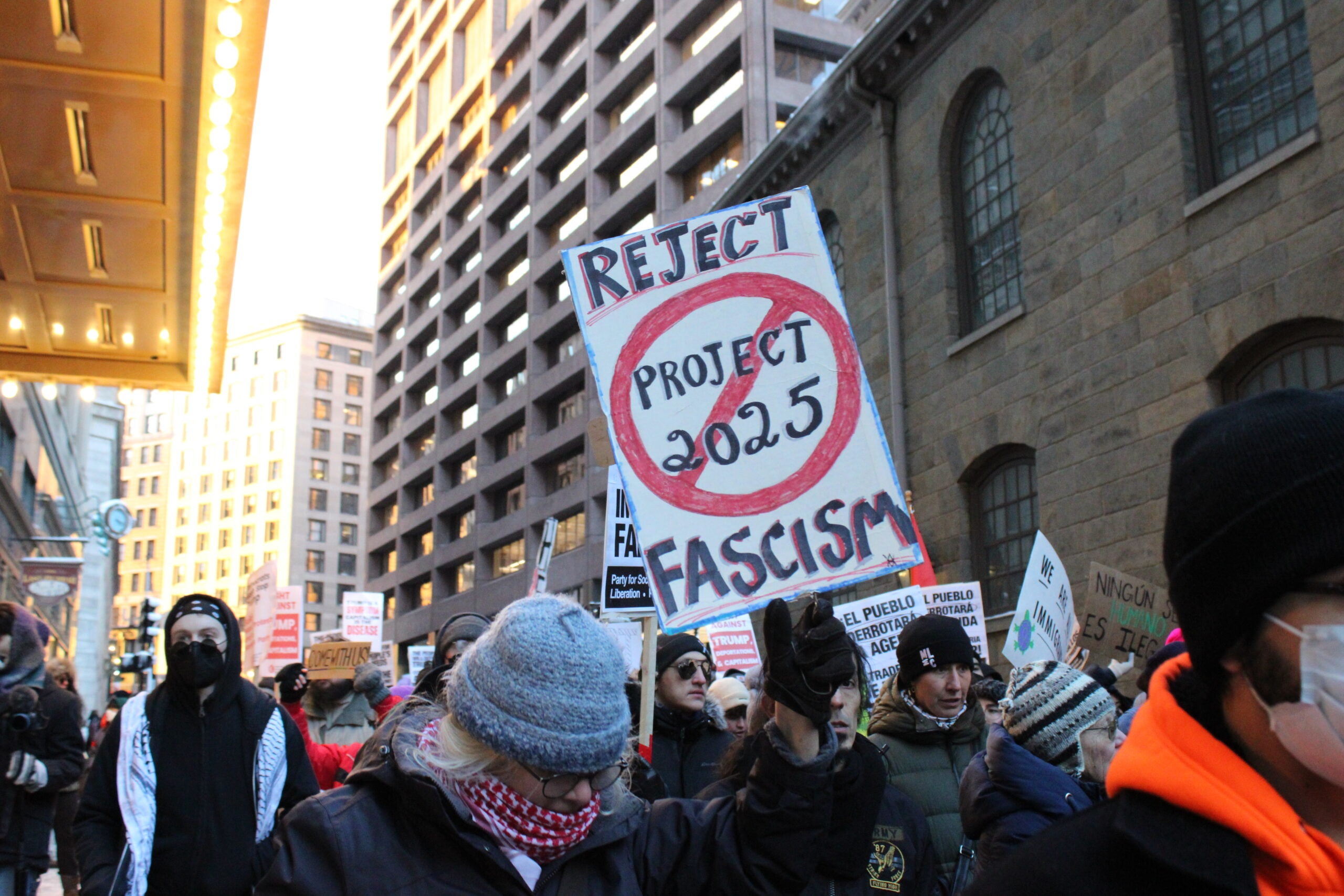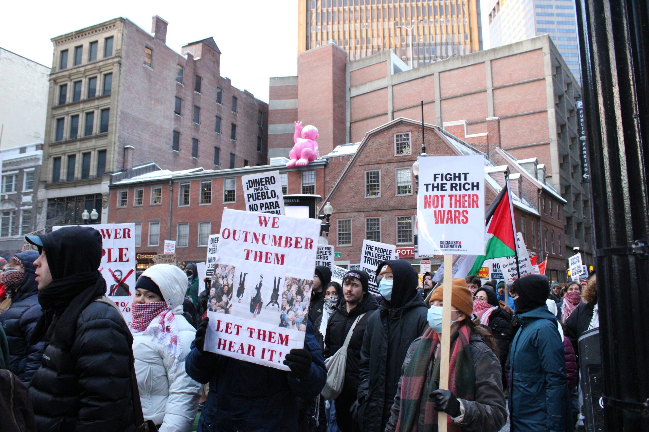 Demonstrators marched through Downtown Crossing Monday afternoon, protesting what organizers called President Donald Trump’s “extreme far-right billionaire agenda” hours after he was sworn in for his second term as president.