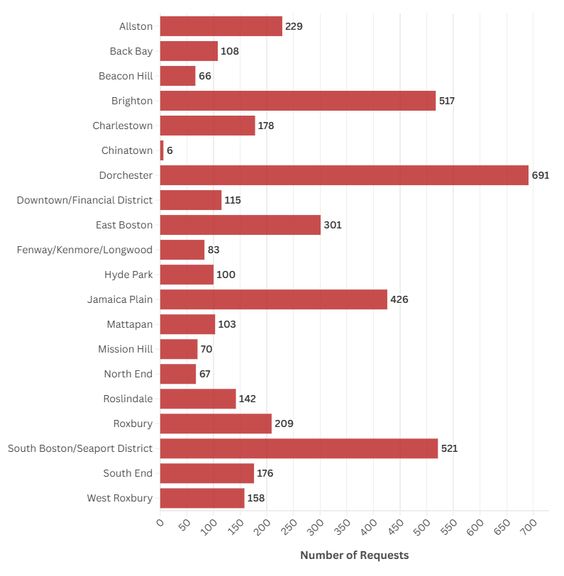 The number of requests per neighborhood mostly correlated with the size of each neighborhood’s population. For instance, Dorchester and Chinatown, which received the most and least requests respectively, also have the largest and smallest respective populations, according to 2020 census data.