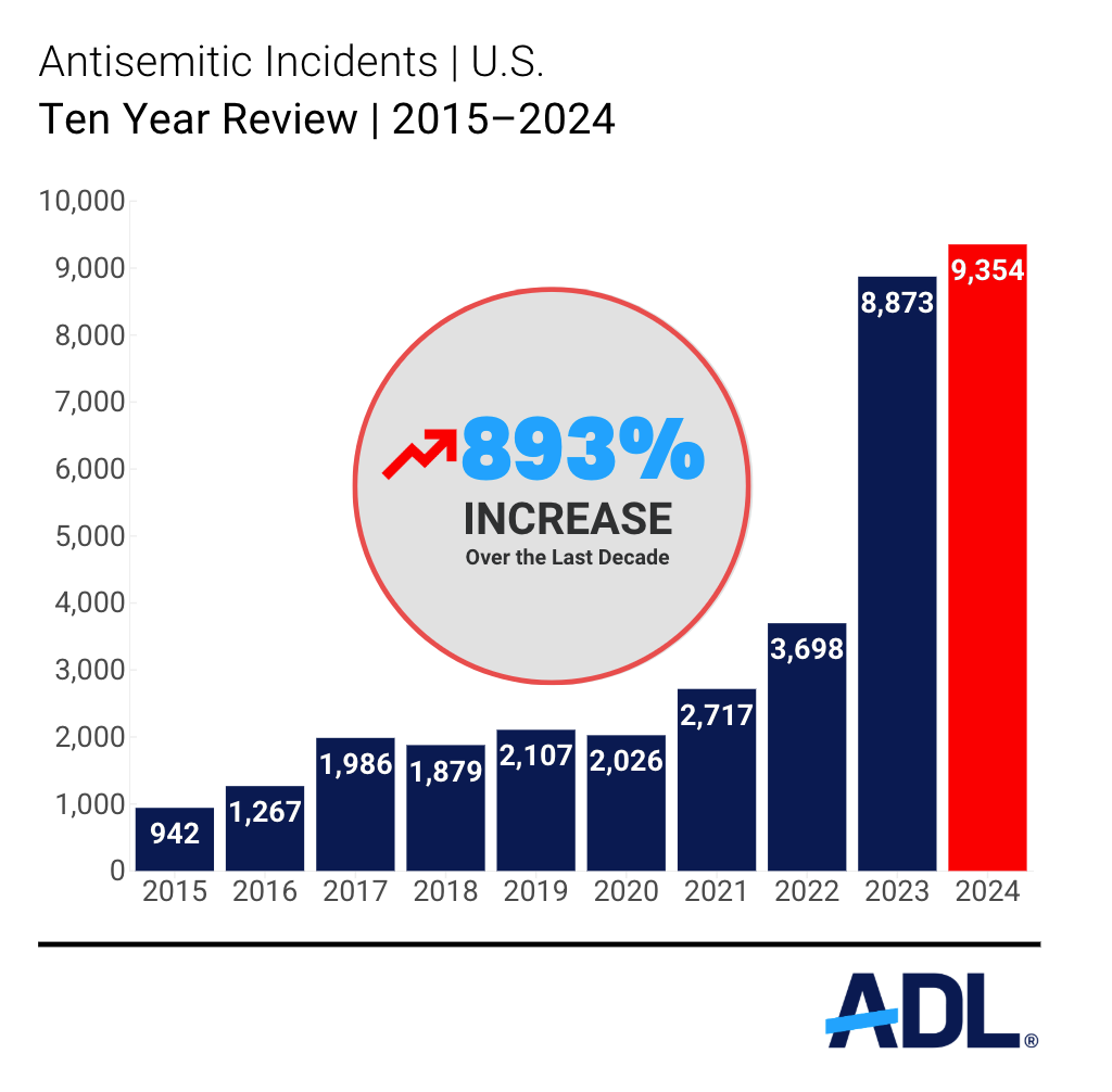 The audit, which is made up of both criminal and non-criminal incidents reported to ADL by victims, law enforcement, the media, and partner organizations, has been conducted and published annually since 1979. ADL tabulated 9,354 antisemitic incidents nationwide last year, the highest number on record since the annual audits started in 1979 and a 5% increase from the 8,873 incidents recorded in 2023. There has been a 344% increase in incidents over the past five years and an 893% increase over the past 10 years.