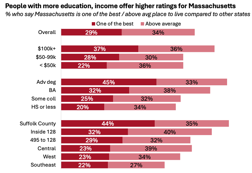The poll showed that people with higher education and income levels were more likely to rank Massachusetts highly as a place to live. There were also regional differences, with those closer to Boston offering higher ratings.