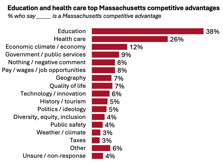 The Index added a companion poll conducted this July by the MassINC Polling Group. It showed that most respondents identified quality of education and health care as Massachusetts’ competitive strengths.