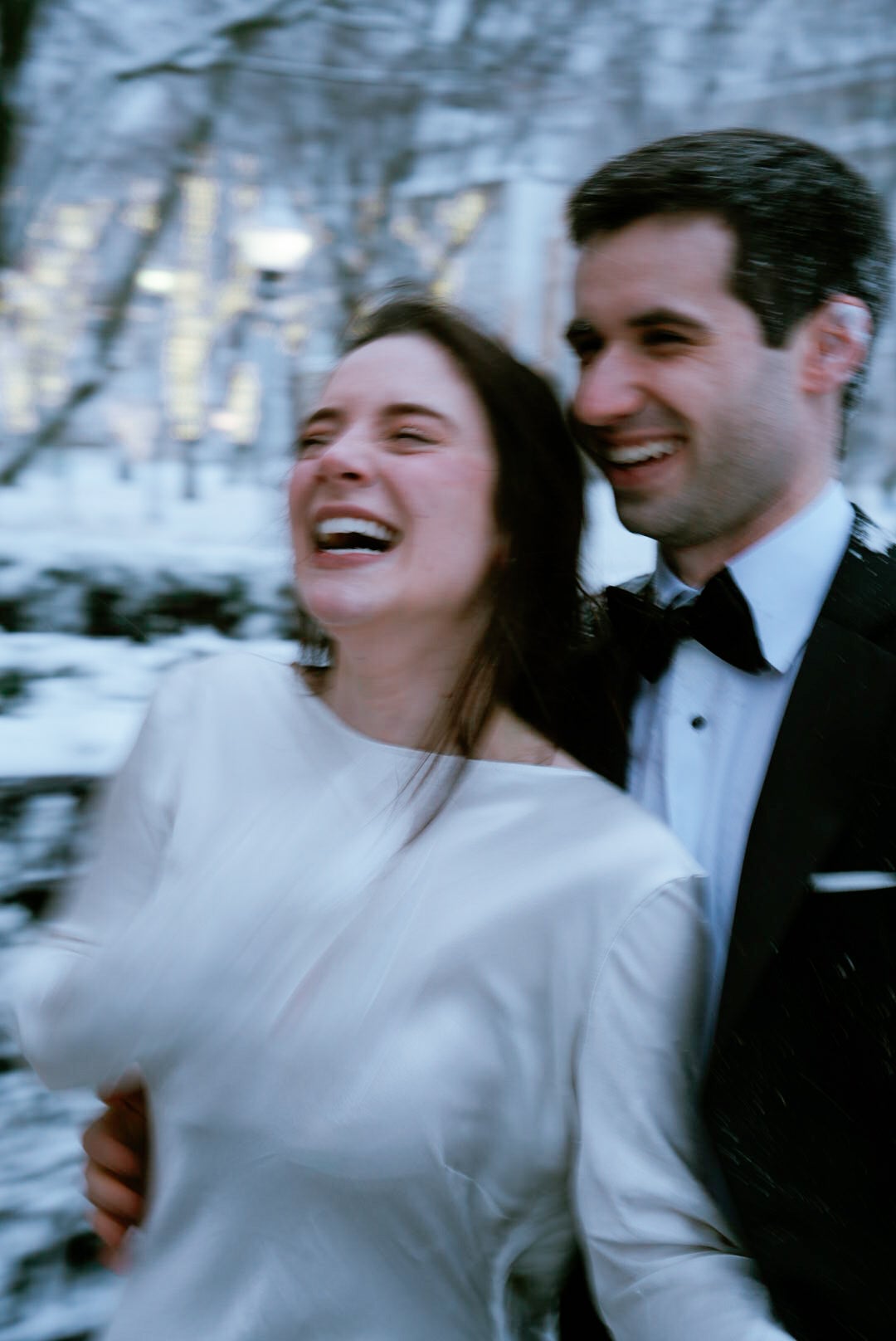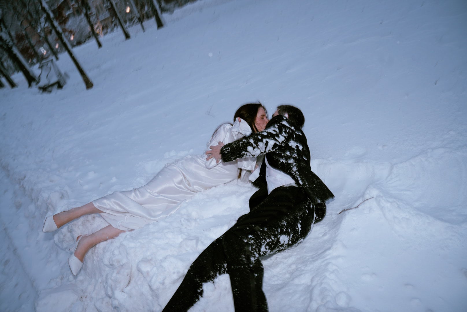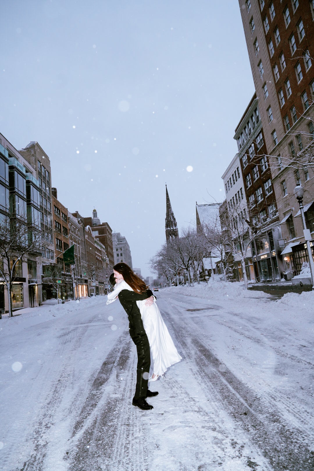 After saying “I do,” the newlyweds stepped into the blizzard for photos on a deserted Newbury Street. At one point, the newlyweds laid down in the fresh snow, still dressed in their wedding attire.