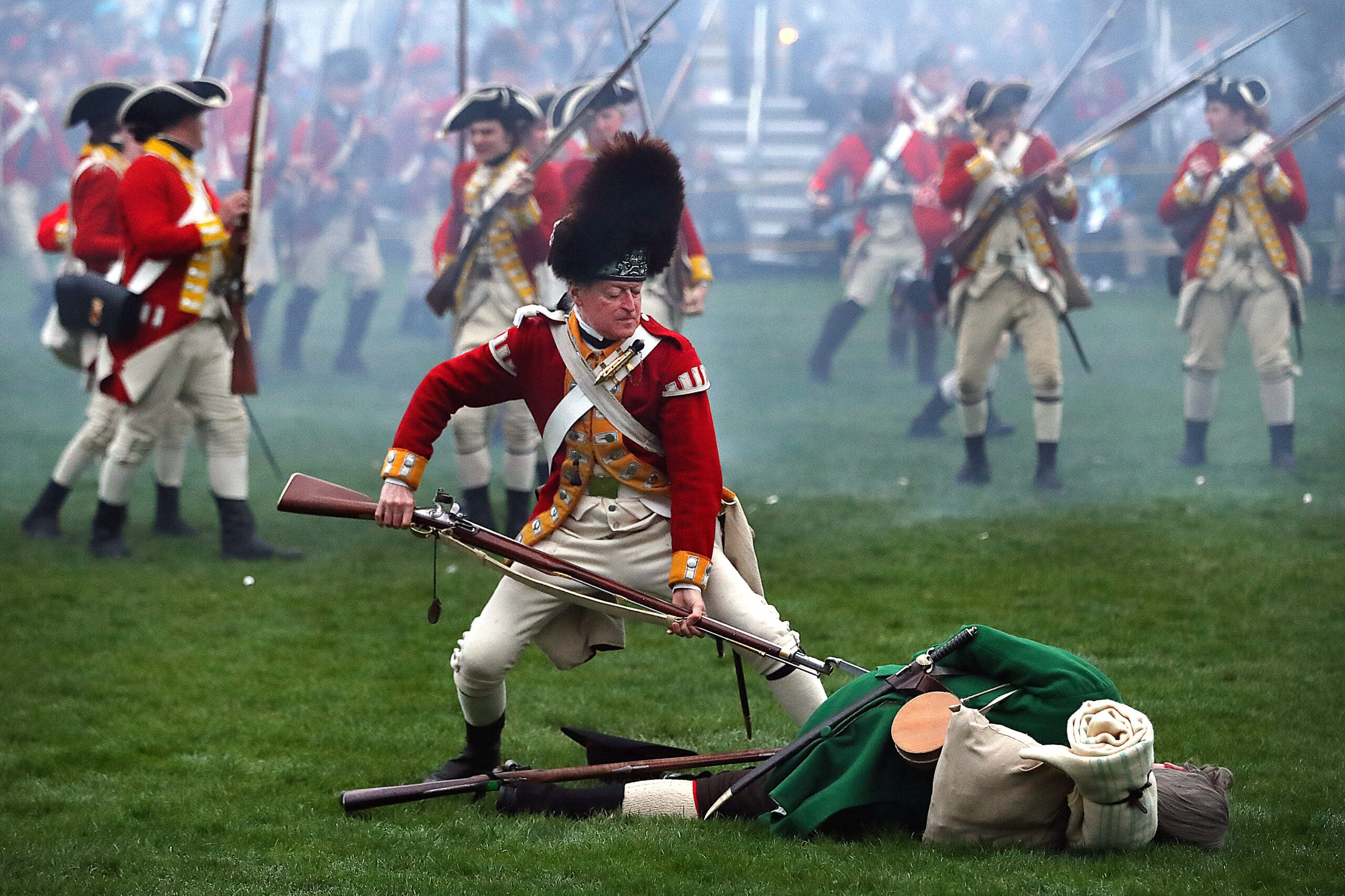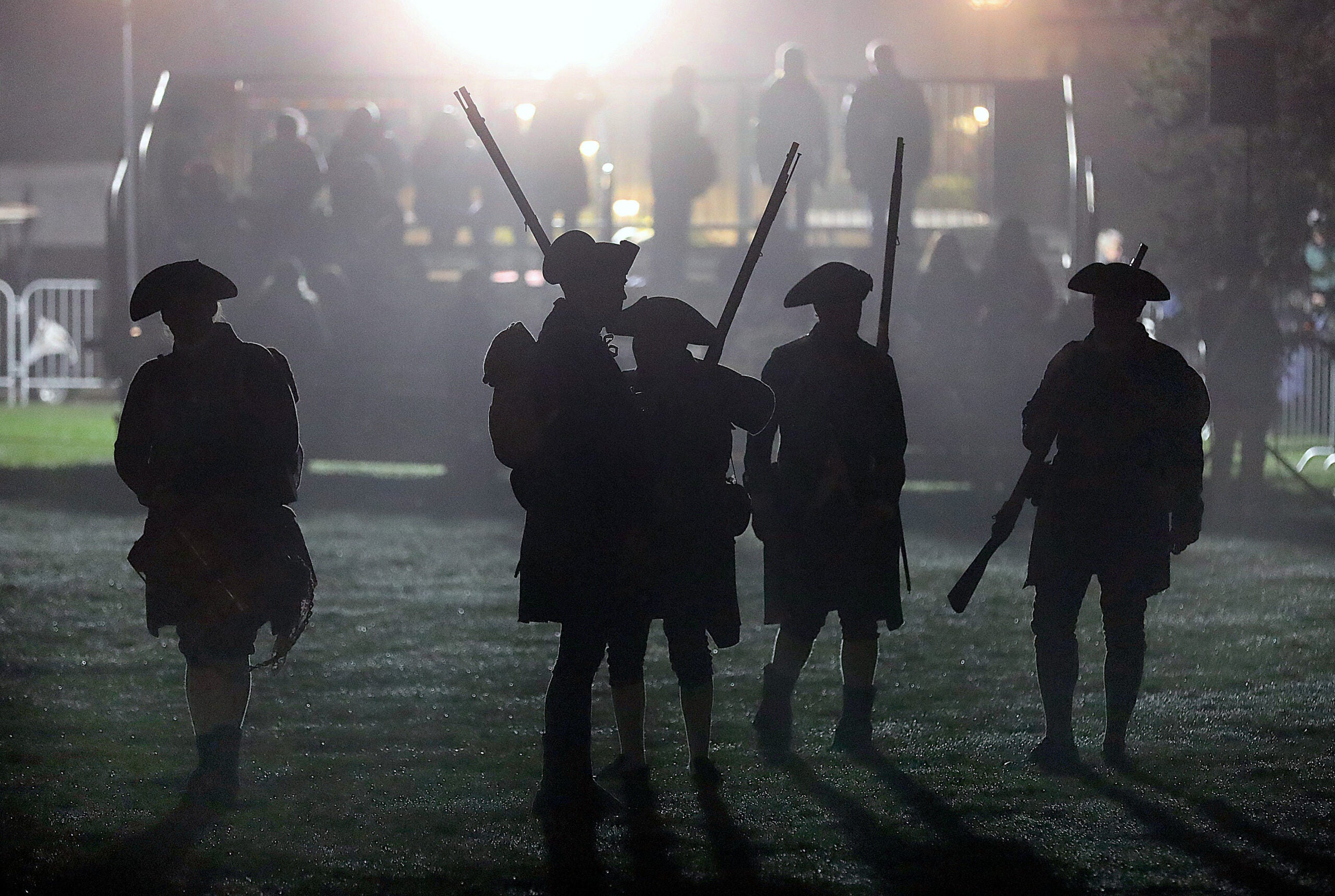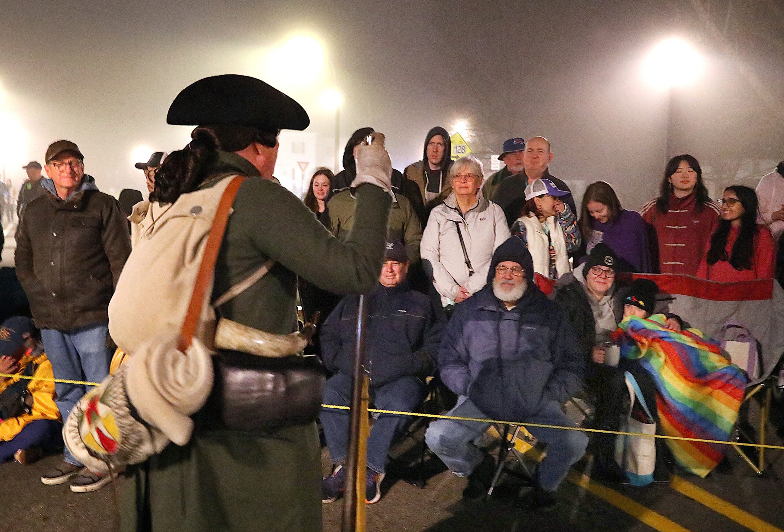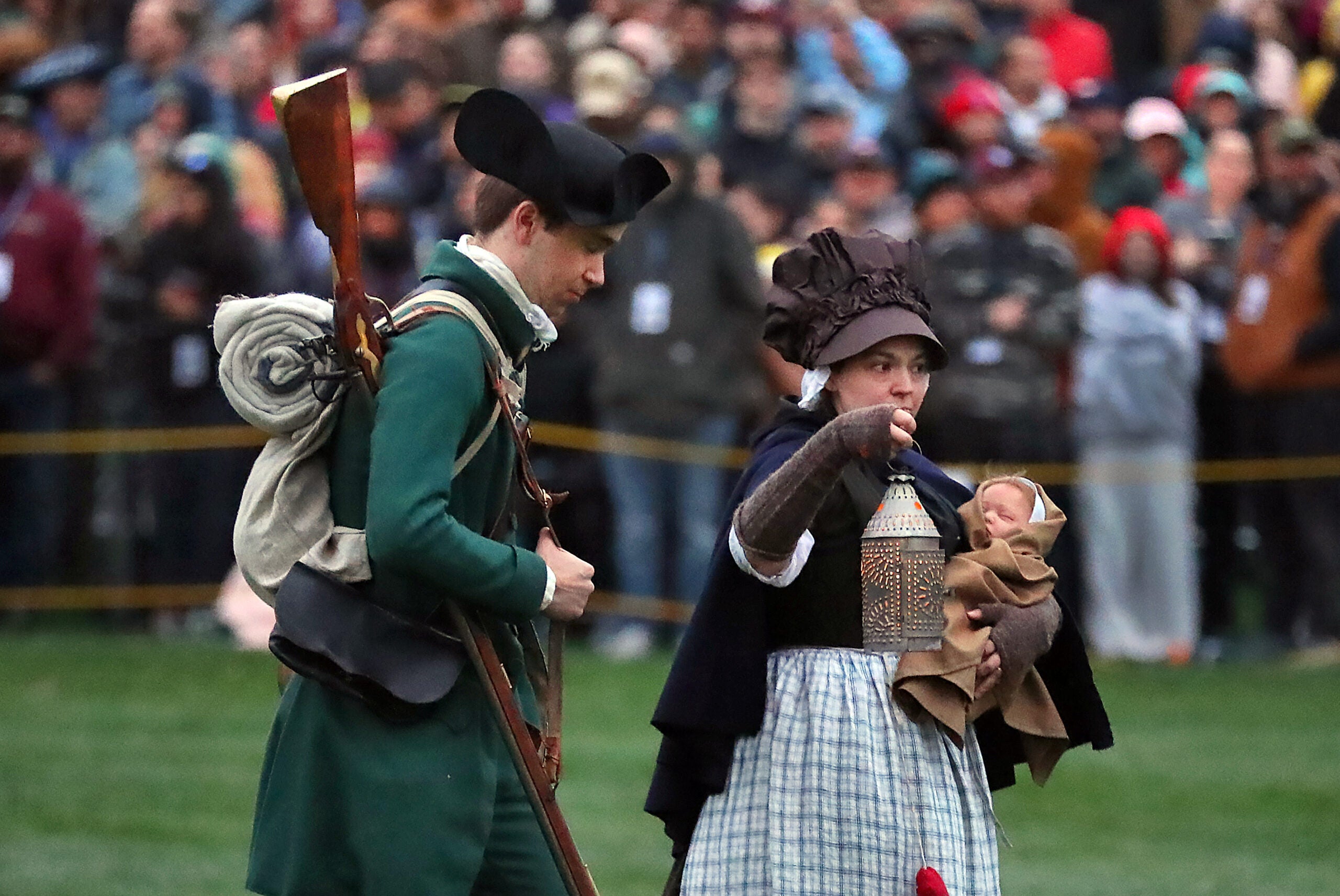Crowds gathered before dawn Saturday on the Lexington Battle Green as the town reenacted the opening moments of the American Revolution.