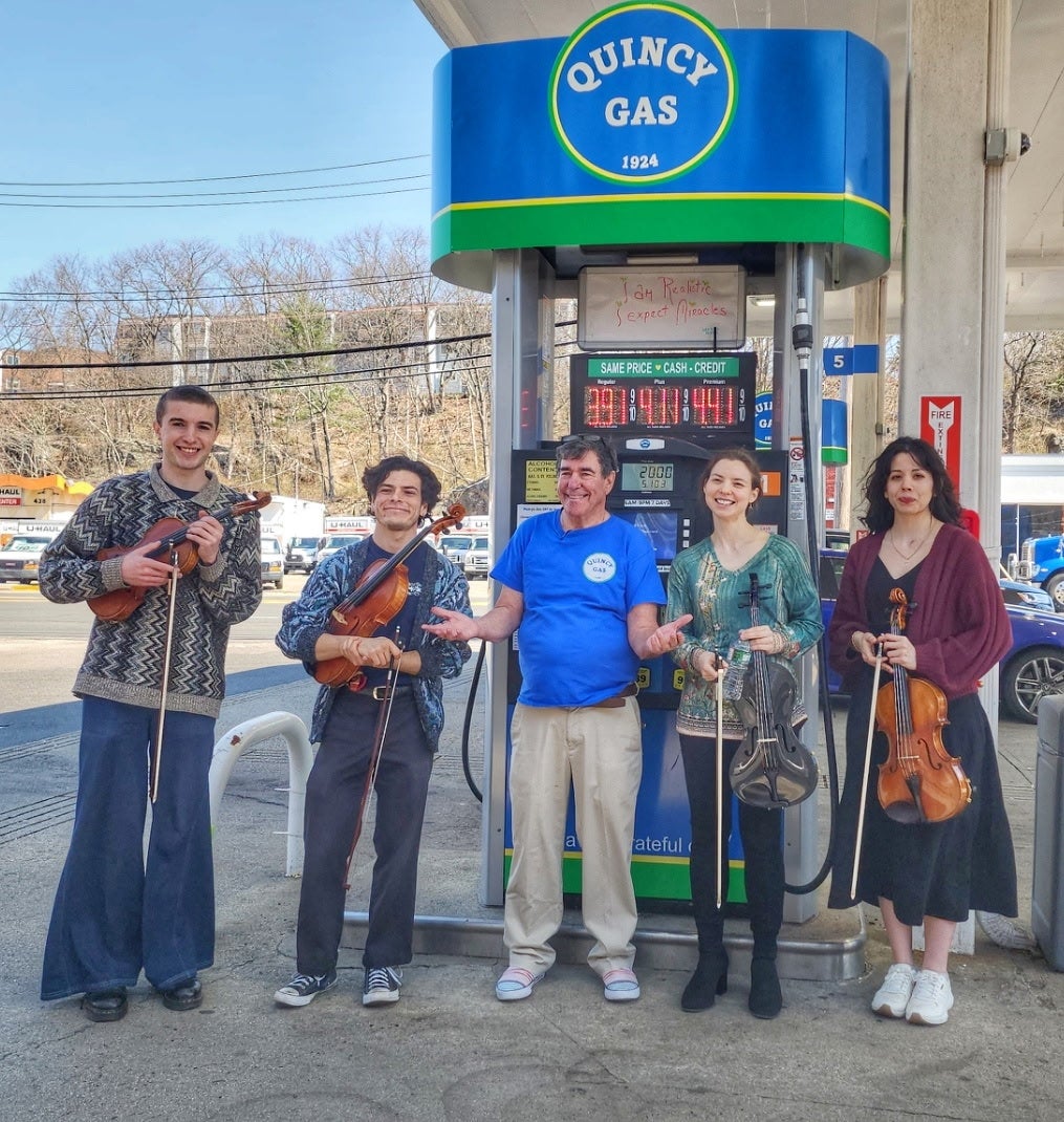 On a mild April morning, the steady rhythm of cars pulling in and out of Quincy Gas was interrupted by something unusual: live classical music drifting beneath the metal canopy.