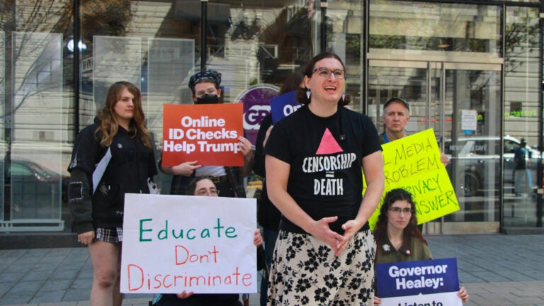 About a dozen people gathered outside the Boston Public Library Tuesday to protest the legislation while Healey spoke on GBH’s “Boston Public Radio.”