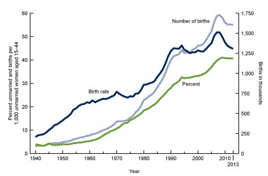 According to the study, the rate peaked in 2008 at about 52 babies per 1,000 unmarried women of childbearing age. It then dropped to 45 births in 2013. There’s a good chance this decline mirrors the economic recession and declines in overall fertility that started in 2008.