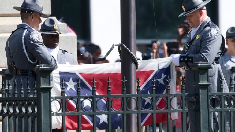 Amid a largely cheering crowd, the flag was removed from atop a 30-foot pole at 10 a.m. after state lawmakers passed a bill calling for its removal. The stars-and-bars flag was then folded per custom and escorted toward a nearby museum.