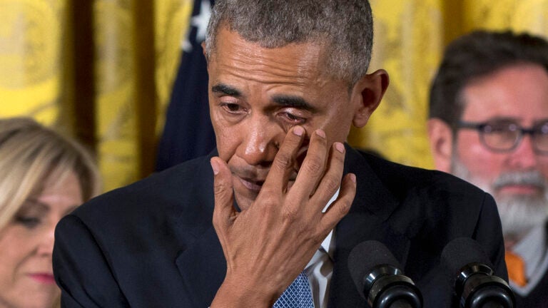 A teary-eyed President Obama took a lengthy pause and cried when speaking on Tuesday about the 2012 shooting that killed 26 children and adults in Newtown.