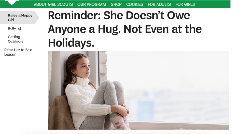 The gist, the Girl Scouts added, was that girls need to be given the space to decide when and how they want to show affection. “Of course, many children may naturally want to hug and kiss family members, friends, and neighbors, and that’s lovely — but if your daughter is reticent, don’t force her,” the organization said.