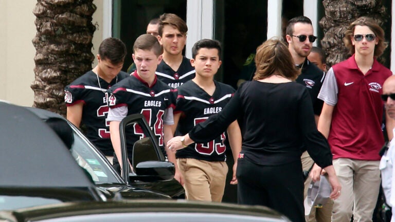 Football players wearing Stoneman Douglas jerseys carried Feis’ casket into the Thursday service at the Church of the Glades in Coral Springs where family and friends gathered to remember him as loyal and caring.