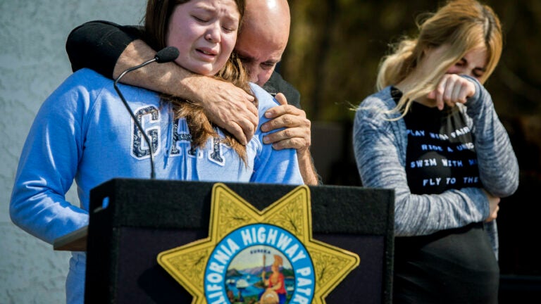 PASADENA, Calif. (AP) — The pregnant wife of a man killed by a boulder that crashed through the window of their car near Los Angeles is pleading for information that leads to the arrest of the person responsible for pushing the rock off an overpass.