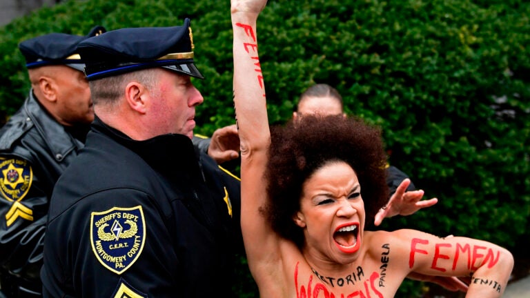 NORRISTOWN, Pa. (AP) — A topless protester with “Women’s Lives Matter” written on her body jumped a barricade and got within a few feet of Bill Cosby on Monday as the comedian walked into a suburban Philadelphia courthouse for the start of his sexual assault retrial.