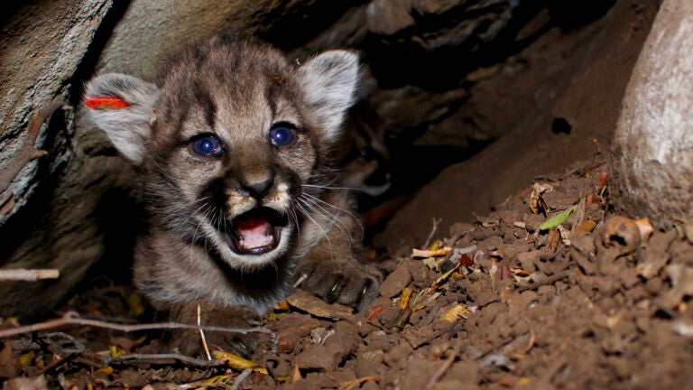 THOUSAND OAKS, Calif. (AP) — Four new mountain lion kittens have been found by researchers studying the wild cats living in Southern California’s Santa Monica Mountains, wildlife officials announced in video posts Tuesday showing the blue-eyed babies meowing and one feisty one hissing and even taking a swipe at the person filming her.