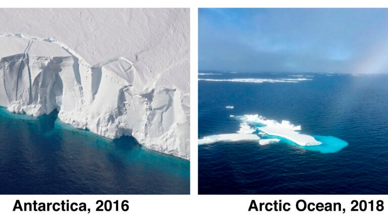 THE FACTS: The photos, which aim to show the effects of climate change, are of different ice formations and have been falsely captioned. They have been shared more than 200,000 times as part of the “10 Year Challenge” meme, which started on social media to show how something or someone has changed over 10 years. But the comparison uses two completely different ice formations, on different ends of the Earth. One photo, labeled as being from 2008, shows the Getz Ice Shelf in Antarctica. It was taken in November 2016 by Jeremy Harbeck, a NASA scientist, during a research flight for NASA. “In 2008, I was not even working on this project,” Harbeck told The Associated Press. The other image, taken in 2018 by Julienne Stroeve, an ice scientist with the University of Manitoba, shows a remnant of ice in the Chukchi Sea, part of the Arctic Ocean. “This picture is really misleading,” said Stroeve, who said she took the photo while collecting data about ice positions in the summer. “You can’t just cherry pick individual years. You have long-term change happening.” Harbeck’s photo was used Monday with an AP report about a newly released study that found ice in Antarctica is melting more than six times faster than it did in the 1980s.