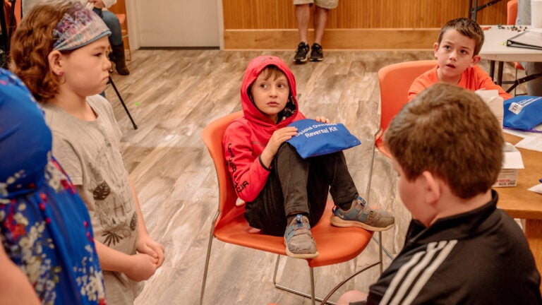 “It’s just like a little squirt gun,” she told the group of children, before passing around the small plastic device for them to hold and squeeze. At the end of the session, each child received a blue zippered bag containing two doses of Narcan to take home.