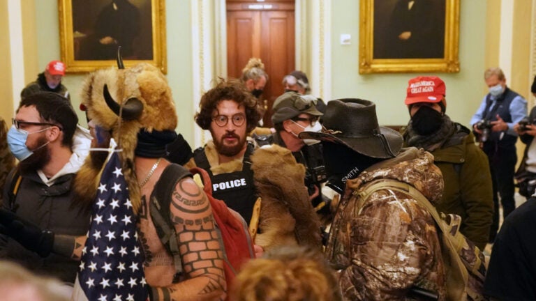 The video showed Mostofsky wearing fur pelts and what appeared to be a bulletproof vest while holding a protective shield belonging to the Capitol Police.