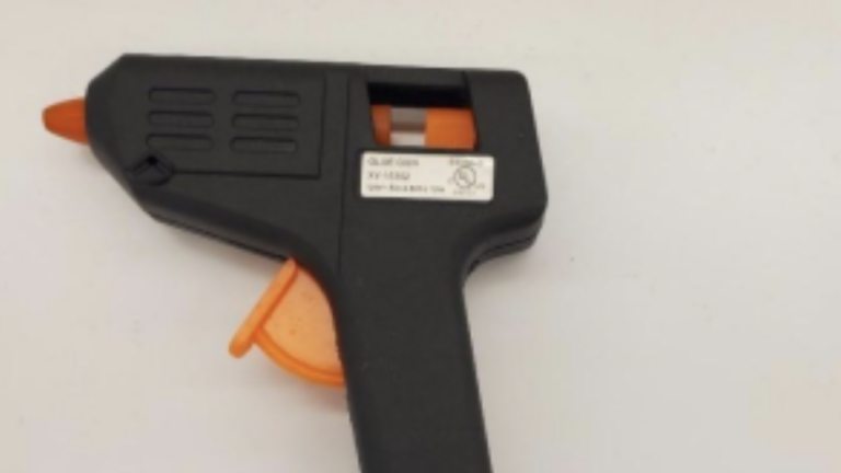 The name of the product is Crafter’s Square Glue Guns, which are described as being a plastic glue gun that is black with an orange trigger and tip. The glue guns also have a silver UL listed label located above the handle with “GLUE GUN” and “XY-15302” printed on it.