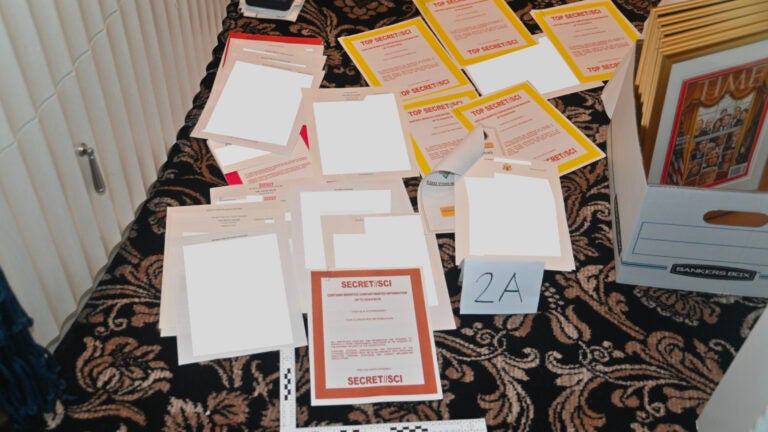 But the most easily digestible element of the filing was appended at the end: a single photograph showing documents with secret and top secret markings arrayed on a patterned carpet, with a carton of framed pictures on one side. The photograph did not clearly display any details of the subject matter of the documents, which were conspicuously bordered in red when labeled secret and in yellow for top secret.